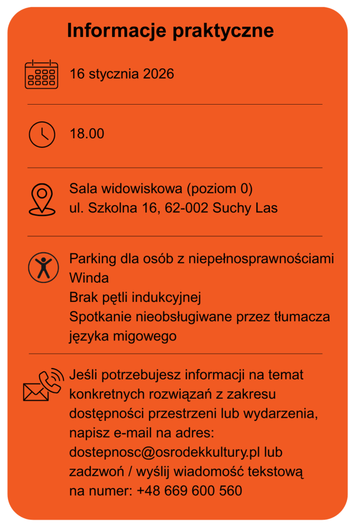 Centrum Kultury i Biblioteka Publiczna Gminy Suchy Las serdecznie wszystkich zaprasza na spotkanie autorskie z Arturem Andrusem, które odbędzie się 16 stycznia 2026 o godzinie 18.00. Poprowadzi je Anna Jaworska. Wstęp na spotkanie jest bezpłatny. Wejściówki są dostępne w Bibliotece Publicznej w Suchym Lesie, filii bibliotecznej w Złotnikach i Chludowie.