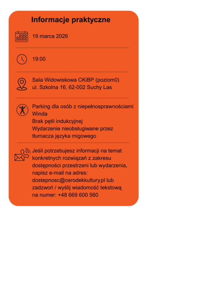 bilety: 120/90 zł (N/U*) oraz 114/85,50 zł (N/U*) z kartą mieszkańca Gminy Suchy Las do nabycia na www.bilety24.pl oraz w sekretariacie CKiBP